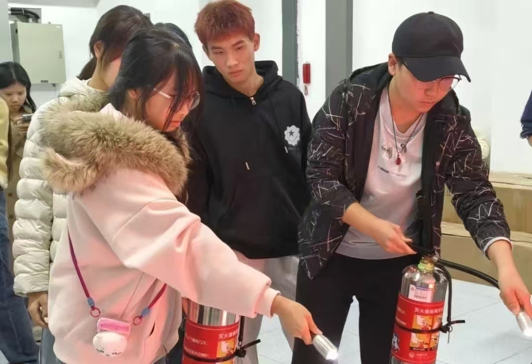 消防实训现场在现场,工作人员详细讲解电子灭火器的工作原理、使用方法及注意事项,同步演示“提起灭火器、拔掉保险销、握住喷管、对准火源根部喷射”的标准流程,并重点强调不同火情的应对策略,确保学生扎实掌握技能。