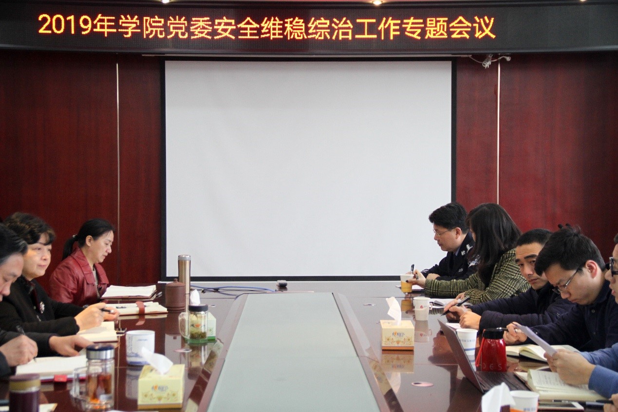 2019年3月13日上午,我院在行政办公楼517会议室召开了2019年院党委安全维稳综治工作专题会议,院党委书记周忠新、院长李定珍和所有党委委员参加会议。会上,保卫处处长周旭汇报了学校2019年新学期开学以来的安全稳定与综治工作情况。