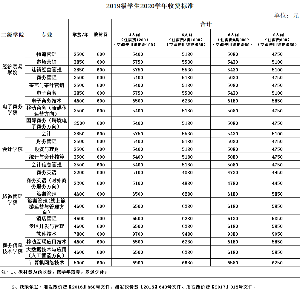 2019级学生2020学年收费标准