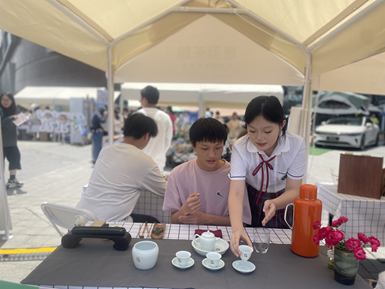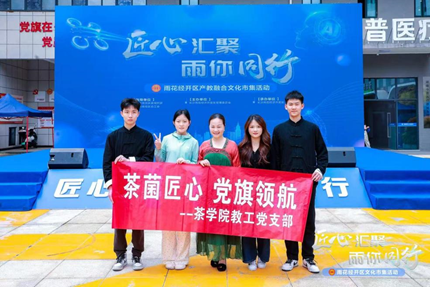 在4月24日启动的“匠心汇聚、雨你同行”雨花经开区文化市集活动中,茶学院优秀学生代表和刘菁宇、刘玉娇等入党积极分子8人组成实践先锋队,开展炒茶工艺展示、安化黑茶历史讲解及茶文化直播等特色项目?;疃殖∩枇?ldquo;先锋示范岗”,入党积极分子刘玉娇同学通过茶艺展演、非遗互动等形式传承中华文化基因。