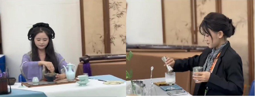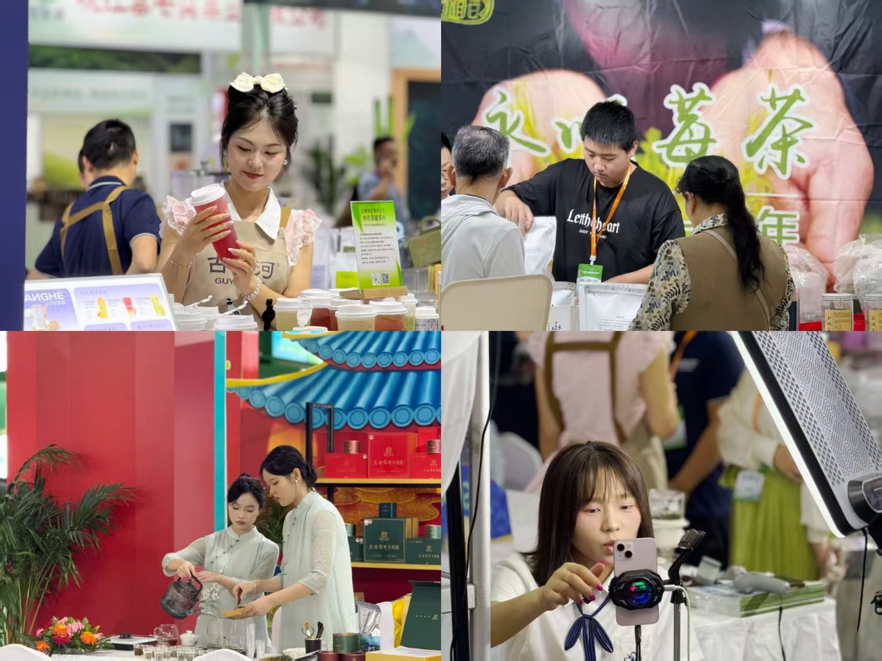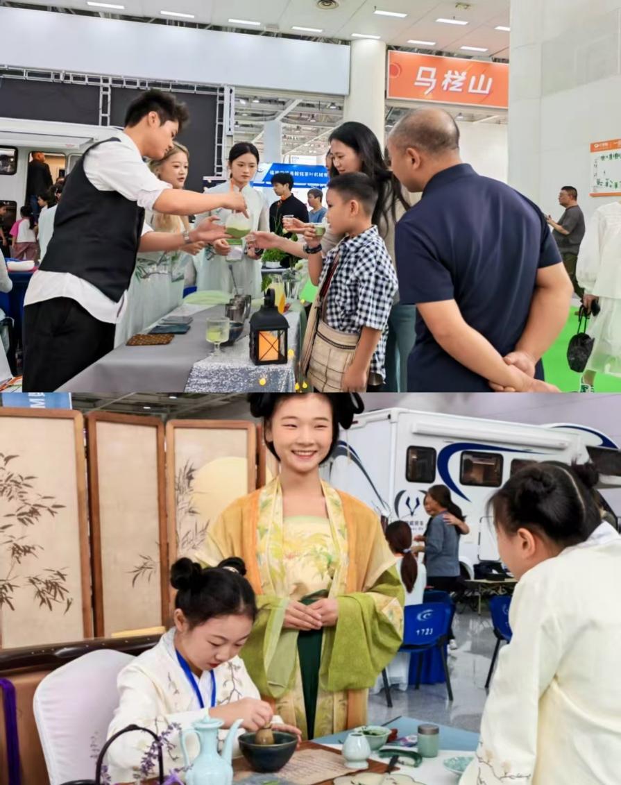 展会期间,茶学院的展区成为现场焦点之一。学生们以茶为媒,带来了一系列专业且富创意的展示:在茶艺表演区,他们或身着宋代雅致服饰,或搭配现代简约装束,在古雅与时尚的碰撞间,巧妙融合宋代点茶与新中式调饮,表演者先是专注碾茶、细腻调膏,再以茶筅轻击茶汤,直至茶汤泛起满盏乳花,尽显古代点茶的雅致;随后又灵活融入鲜奶等食材,调制出兼具传统茶香与现代风味的特调茶饮,这份刚柔并济的演绎,引得观众纷纷驻足观赏、拍照记录。在品茗区,学生们化身专业茶侍,精选湖南特色茶品,凭借课堂所学的专业冲泡技艺,精准把控水温与出汤时长,为往来茶客斟泡香茗;茶客们手捧茶盏细细品味,醇厚茶香搭配学生的贴心服务,让不少人频频点头称赞。在茶席设计区,学生们以 “青春茶韵” 为主题搭建茶席,将现代审美与传统茶文化相融合,巧用花草、木、瓷等天然元素,营造出简约而富有诗意的品茗空间,也传递出年轻一代对茶文化的创新表达。