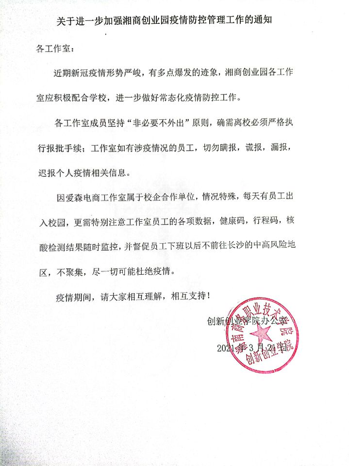 日前,针对日益严峻的抗疫形式,湘商创业园发布《关于进一步加强湘商创业园疫情防控工作的通知》,要求园区所有工作室严格遵守学校各项规章制度,在疫情防控特殊时期,积极配合学校,做好常态化疫情防控。