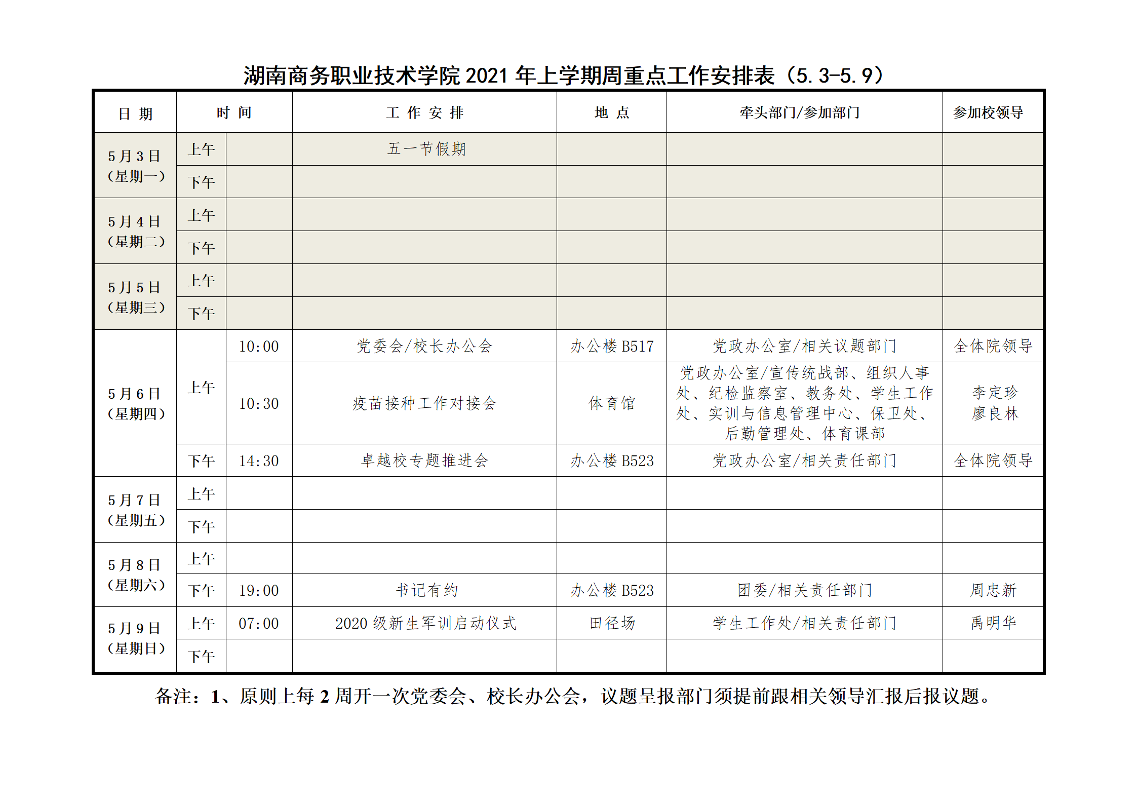 湖南商务职业技术学院2021年上学期周重点工作安排表(5.3-5.9)