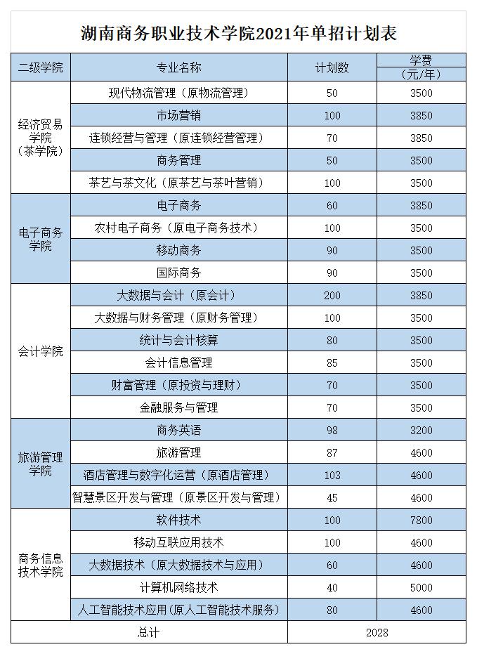 湖南商务职业技术学院2021年单招计划表