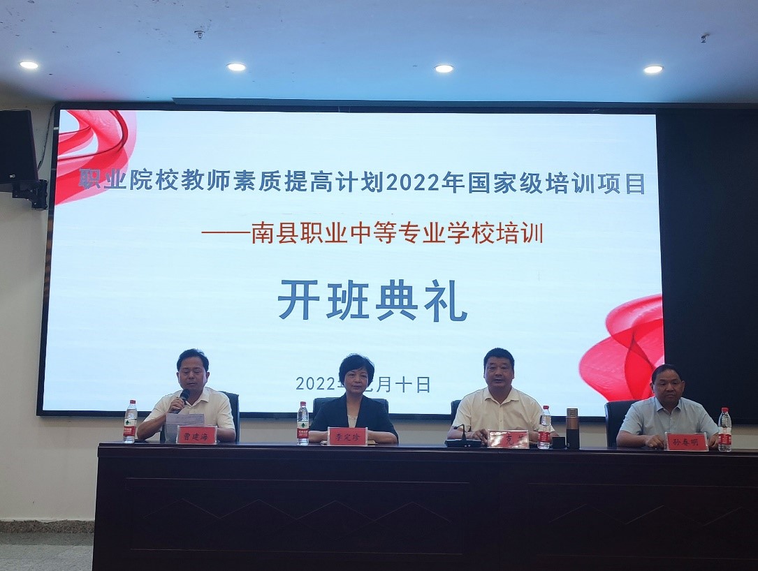 7月10日上午,职业院校教师教育教学素质提高计划2022年国家级培训项目——我院送培南县职业中等专业学校培训班在南县职业中等专业学校行政楼一楼教师会议室正式开班。湖南商务职业技术学院院长李定珍、电子商务学院党总支书记孙春明、电子商务学院副院长袁鑫、电子商务学院党总支副书记刘明浩、班级管理员周训菊、南县职业中等专业学校校长邓克芳、副校长曹建海、副校长郭创乾、教学科主任蔡春辉,以及30名学员出席开班典礼。南县职业中等专业学校副校长曹建海主持开班仪式。