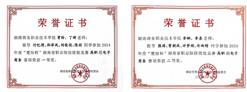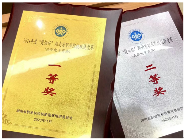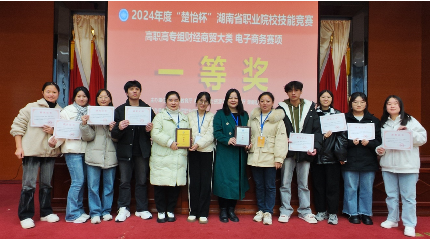 12月1日至12月3日,由湖南省教育厅、湖南省人力资源和社会保障厅及湖南省商务厅联合主办,湖南外贸职业学院承办的2024 年度“楚怡杯”湖南省职业院校技能竞赛电子商务技能赛项圆满收官。在此次比赛中,由我院李喜、曾玲、丁妍、李娜四位指导老师带队,来自电子商务、农村电子商务专业的付忆情(21电商1班)、陈羽(21农商2班)、刘俊羽(22电商3班)、郑泽凤(22电商4班)、曾朝政(22电商3班)、许梦娟(22电商1班)、熊涛(22电商2班)、许雨晴(22电商1班)等8名选手组成的电商技能竞赛团队,经过激烈角逐,从77支参赛队伍中脱颖而出,荣获一等奖一项,二等奖一项。