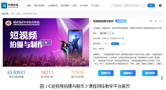 《短视频拍摄与制作》课程是高职移动商务、电子商务、农村电子商务专业的专业核心课程,对接专业国家教学标准、行业标准、全国职业院校技能大赛“短视频创作与运营”赛项标准、“短视频数字化运营”职业技能等级标准,分解短视频运营岗位工作流程,采用“线上+线下”混合教学模式开展短视频分析、策划、拍摄、剪辑与运营教学。教学团队编写了与课程完全配套的新形态立体化教材《短视频设计与制作》,于2023年获得湖南省优秀教材。课程2023年认定为湖南省精品在线开放课程。