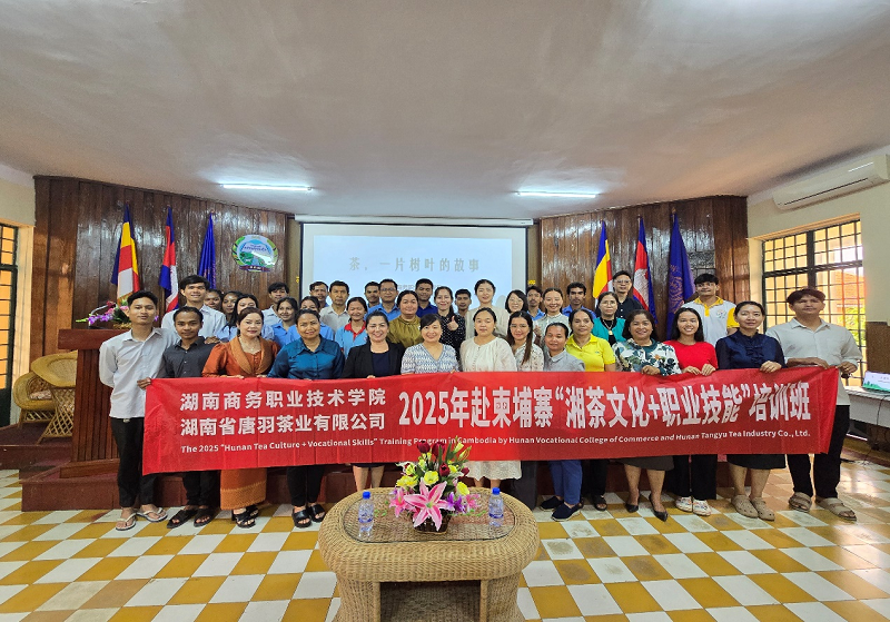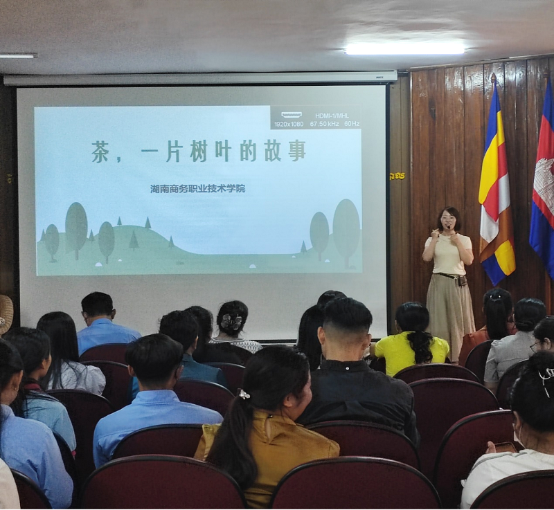 2025年,湖南商务职业技术学院积极响应国家“一带一路”倡议,携手湖南省唐羽茶业有限公司来到柬埔寨波雷列国立农业大学,开展了一场别开生面的“湘茶文化+技能”培训暨“五彩湘茶”文化交流活动。35名师生共同聆听《茶,一片树叶的故事》,感受茶文化的深厚魅力。师生们对中国茶表现出浓厚的兴趣,在互动环节提出各种关于中国茶的问题,授课教师对学员们的问题一一耐心解答。
