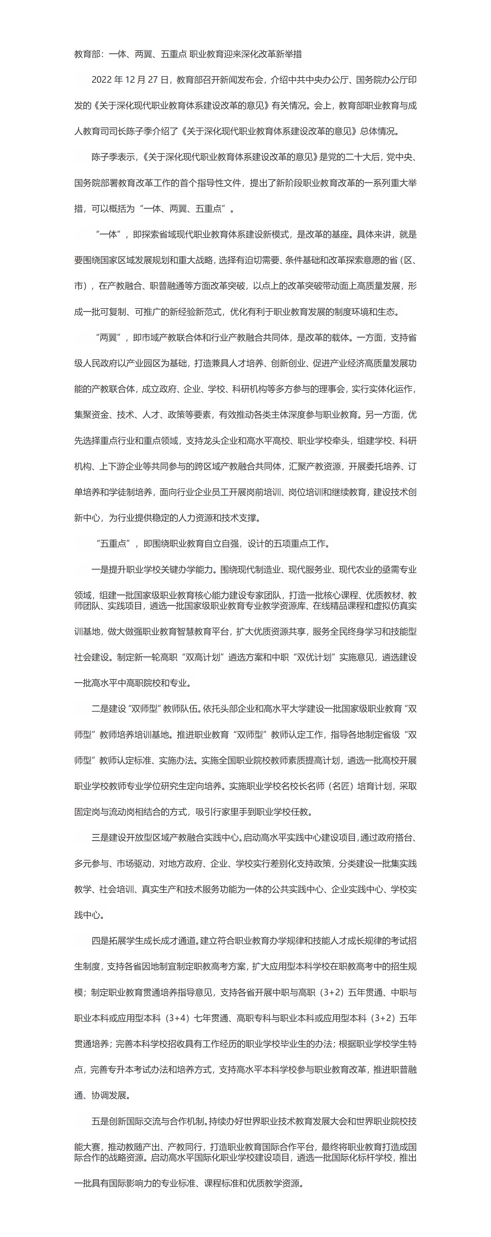 一体、两翼、五重点?职业教育迎来深化改革新举措