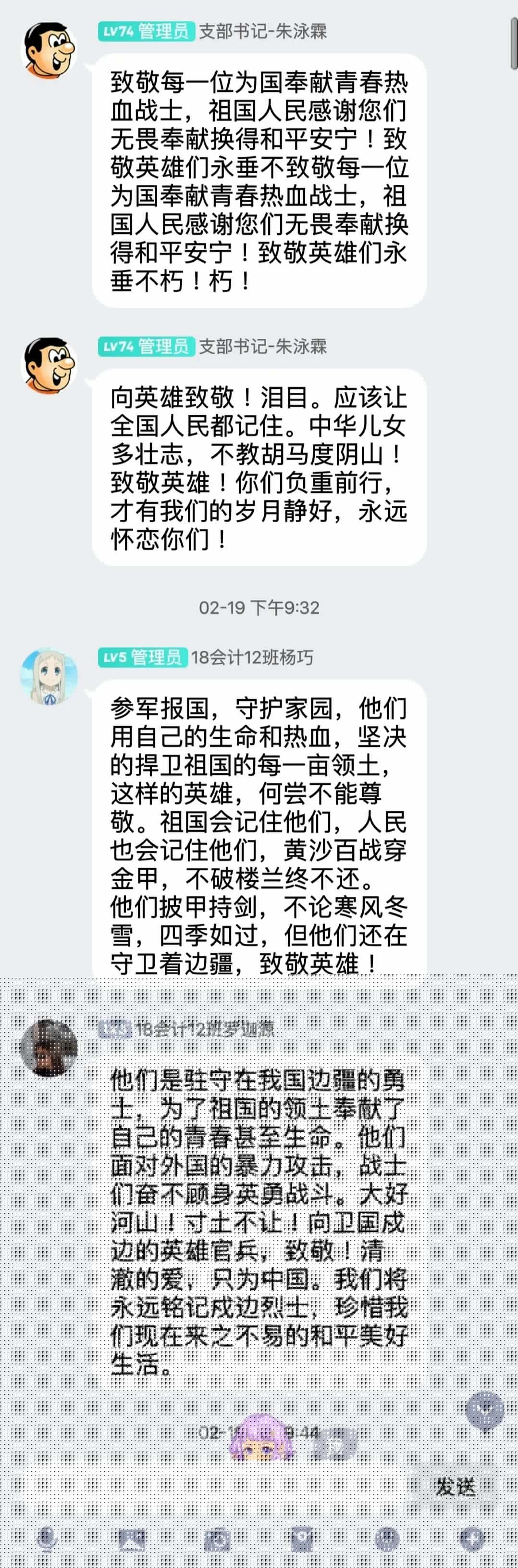 全体党员仔细阅读并认真学习了“军报独家报道:英雄屹立克拉昆仑”后,各自有感而发,在QQ群内积极分享了自己的学习心得,表达了对戍边英雄的敬重与感恩之情,并且大家纷纷表示要学习他们这种无私奉献、艰苦奋斗、报效祖国的精神,不断为祖国的美好未来而奋斗!