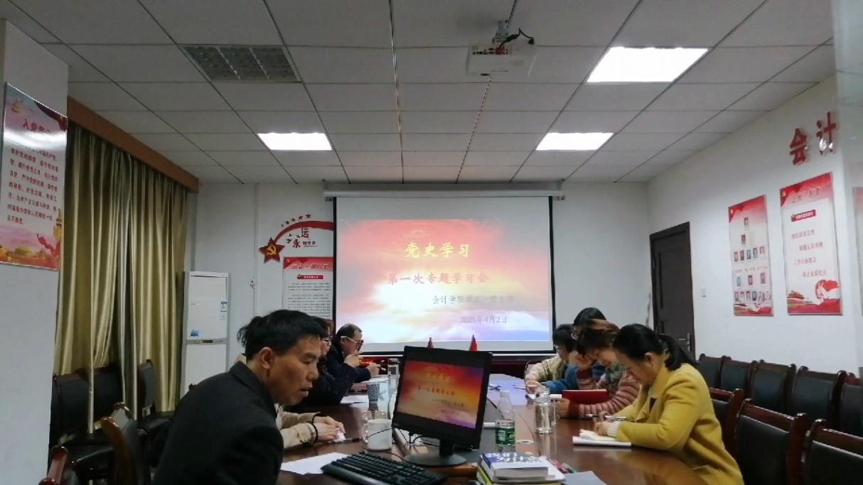 2021年4月2日下午3:00,会计学院学工一党支部在办公楼310召开了本学期第一次党史专题学习会,参会人员为全体教工党员,毕业生党员通过现场录制的视频进行线上学习。会前,支部书记朱泳霖同志就学习党史介绍了本次党史专题学习会的主要内容,首先参会全体党员一同观看了短片《中国共产党百年述职报告》,这段视频以“我”为叙述主线,充分展示中国共产党领导全国各族人民进行进行伟大革命、伟大建设、伟大改革的辉煌历程,激荡着亿万人民群众的澎湃心潮。
