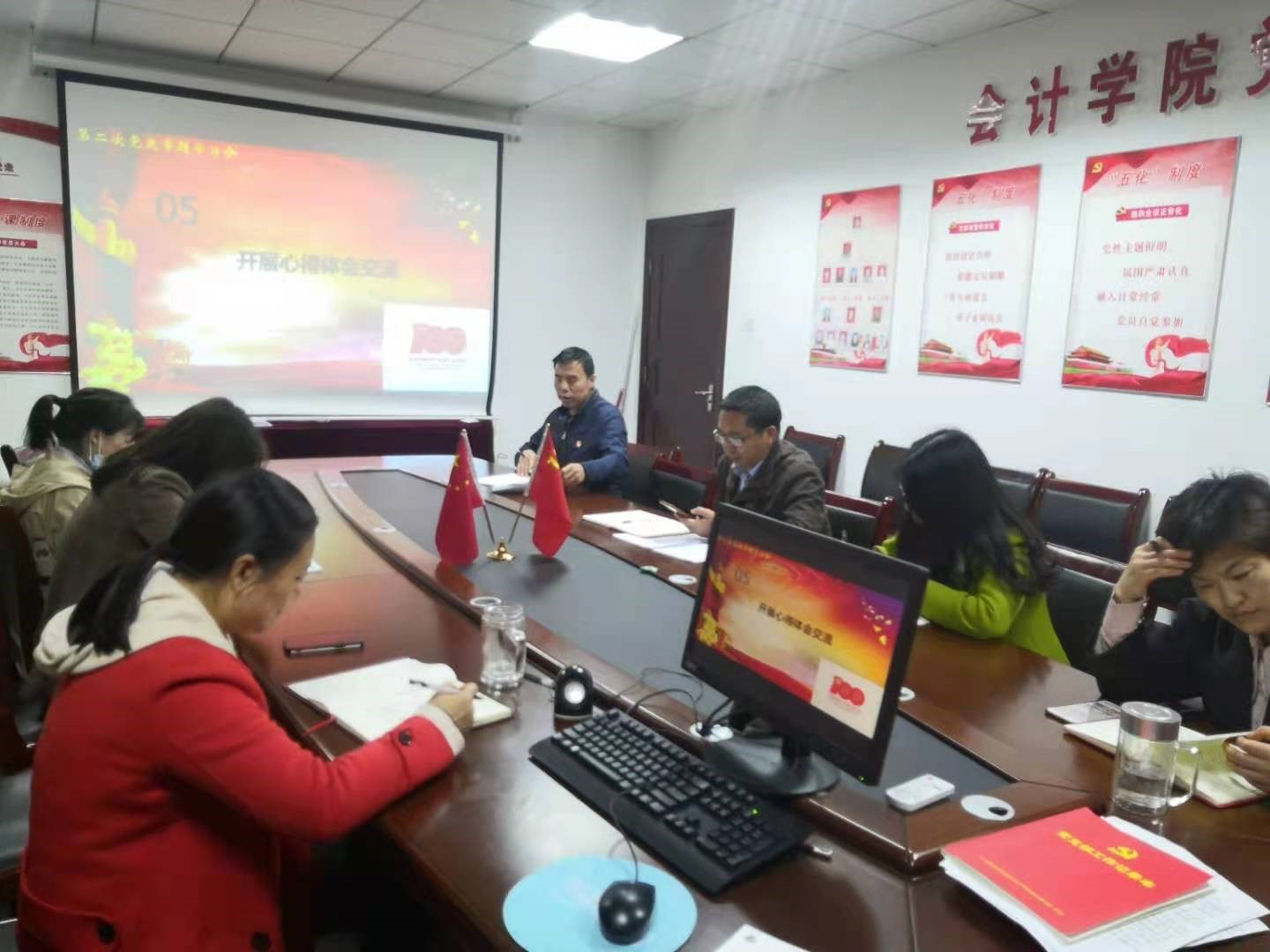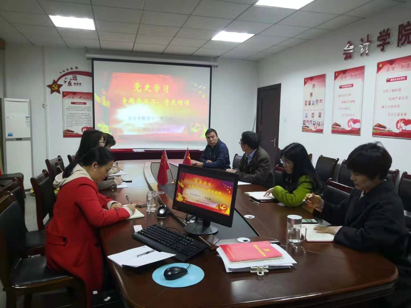 2021年4月28日上午11:00,会计学院学工一党支部在办公楼310召开了本学期第二次党史专题学习会,参会人员为全体教工党员,毕业生党员通过现场录制的视频进行线上学习?;崆?,支部书记朱泳霖同志介绍了本次党史专题学习会主要是对专题二“学史增信”进行学习。