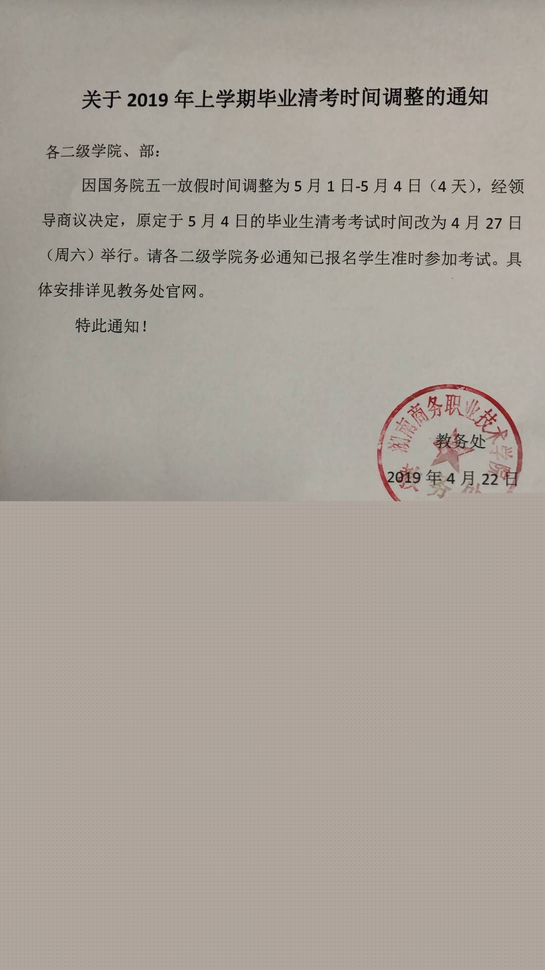 关于2019年上学期毕业清考时间调整的通知