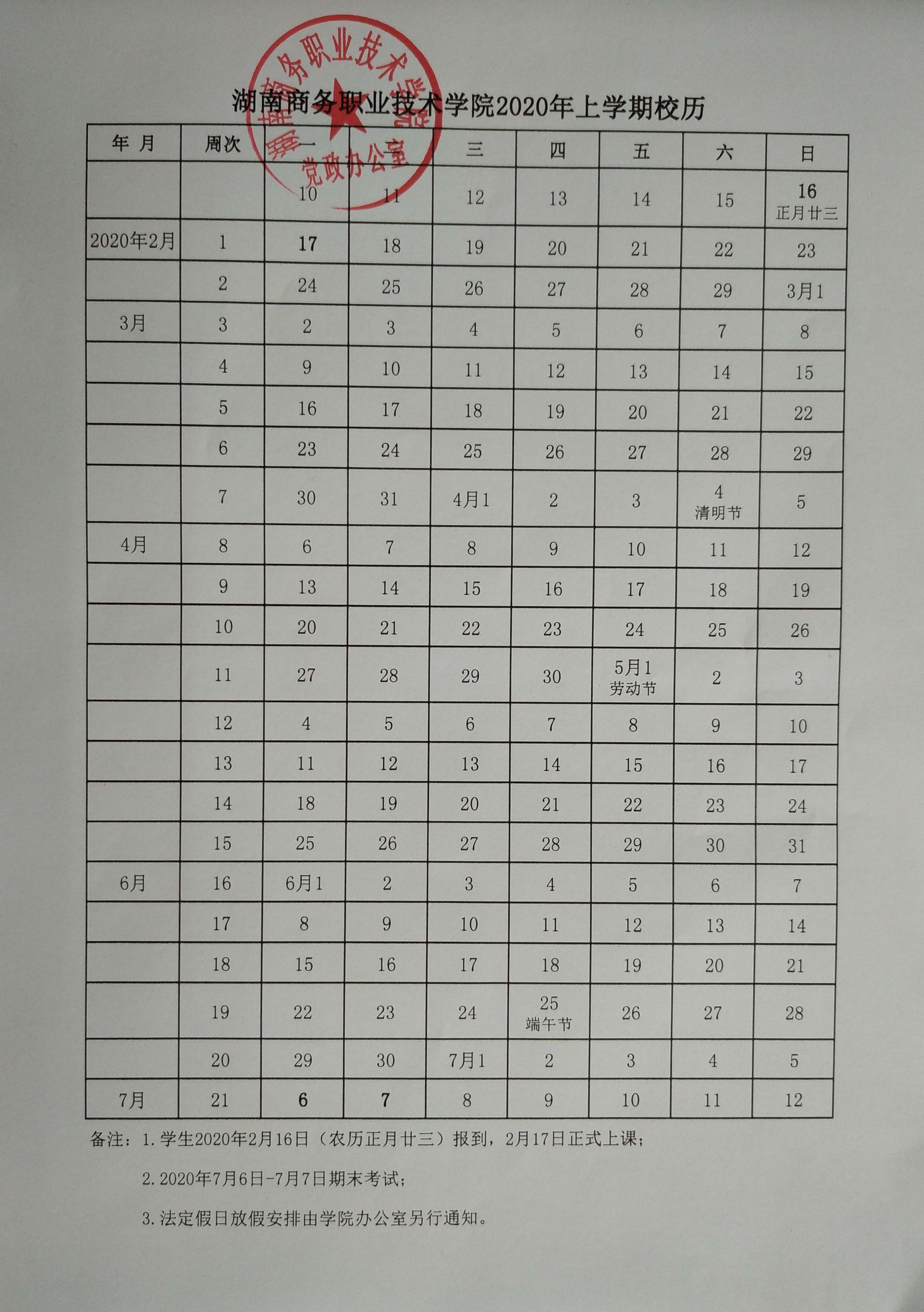 2020年上学期校历