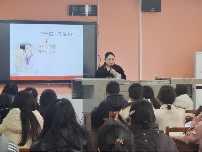 邹老师课前运用AI技术让学生准备小组展示,现场的“李清照认证会”,生动有趣,吸引学生自然深入了解李清照,为师生们徐徐展开了一幅李清照的人生与诗词画卷,以原生家庭、李清照的人生对现代人的启示为突破点解决了教学重点,让人不禁对她充满传奇色彩的一生与精妙绝伦的诗词创作,涌起无限好奇与探究之心。 同时,课堂有机融入思政元素,从李清照在困境中坚守文学理想的精神里,汲取力量,勇敢地面对生活中的挫折与困难;从她对国家命运的关注中,培养社会责任感和家国情怀 。?