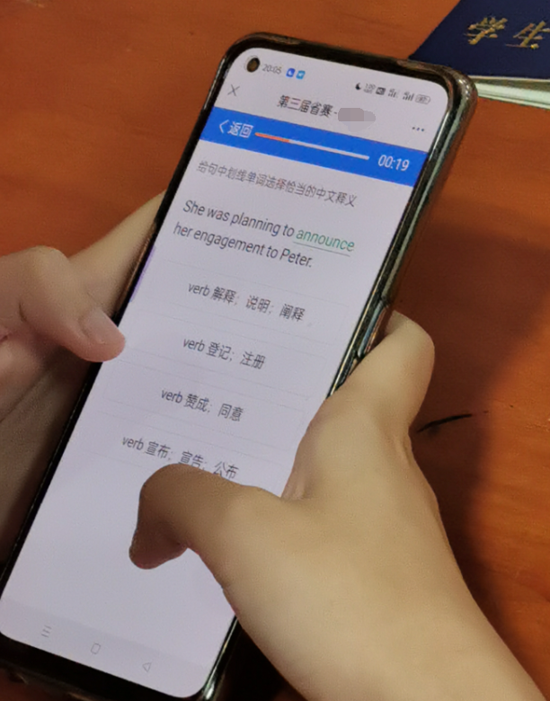 该竞赛面向全??琛洞笱в⒂铩繁拘7怯⒂镒ㄒ笛?,即A班、B班学生。竞赛分初赛和复赛两个阶段进行,主要考核学生对高等学校英语应用能力考试A、B级相关词汇及课程思政相关词汇的掌握情况。竞赛时长60 分,共计160 题,在“词达人”平台上完成竞赛试题作答,系统自动核算成绩。