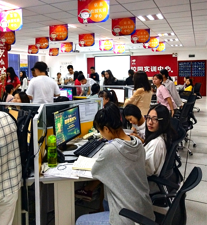 在京东·湘商学院·创新创业实训孵化中心,一行人参观了共享空间、京东客服服务中心等。并在京东客服服务中心与参加该项目的老师和学生团队进行了深入交谈,了解该项目的基本运营情况和学生的收获感受。