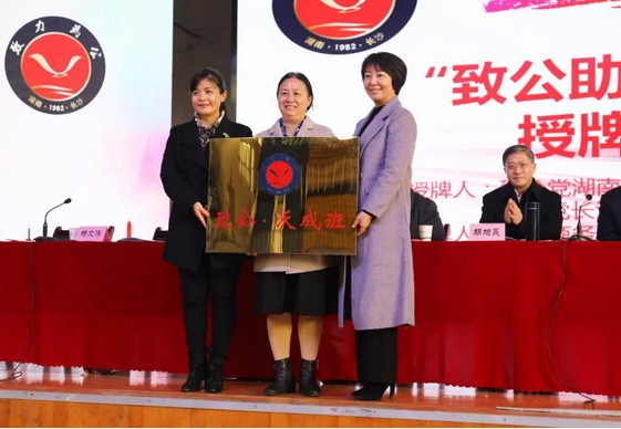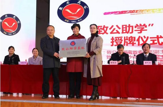 湖南省致公党向我院授“致公助学”基地牌匾和“致公·沃成班”牌匾,湖南商务职业 技术学院院长李定珍、副院长杨文涛分别接牌