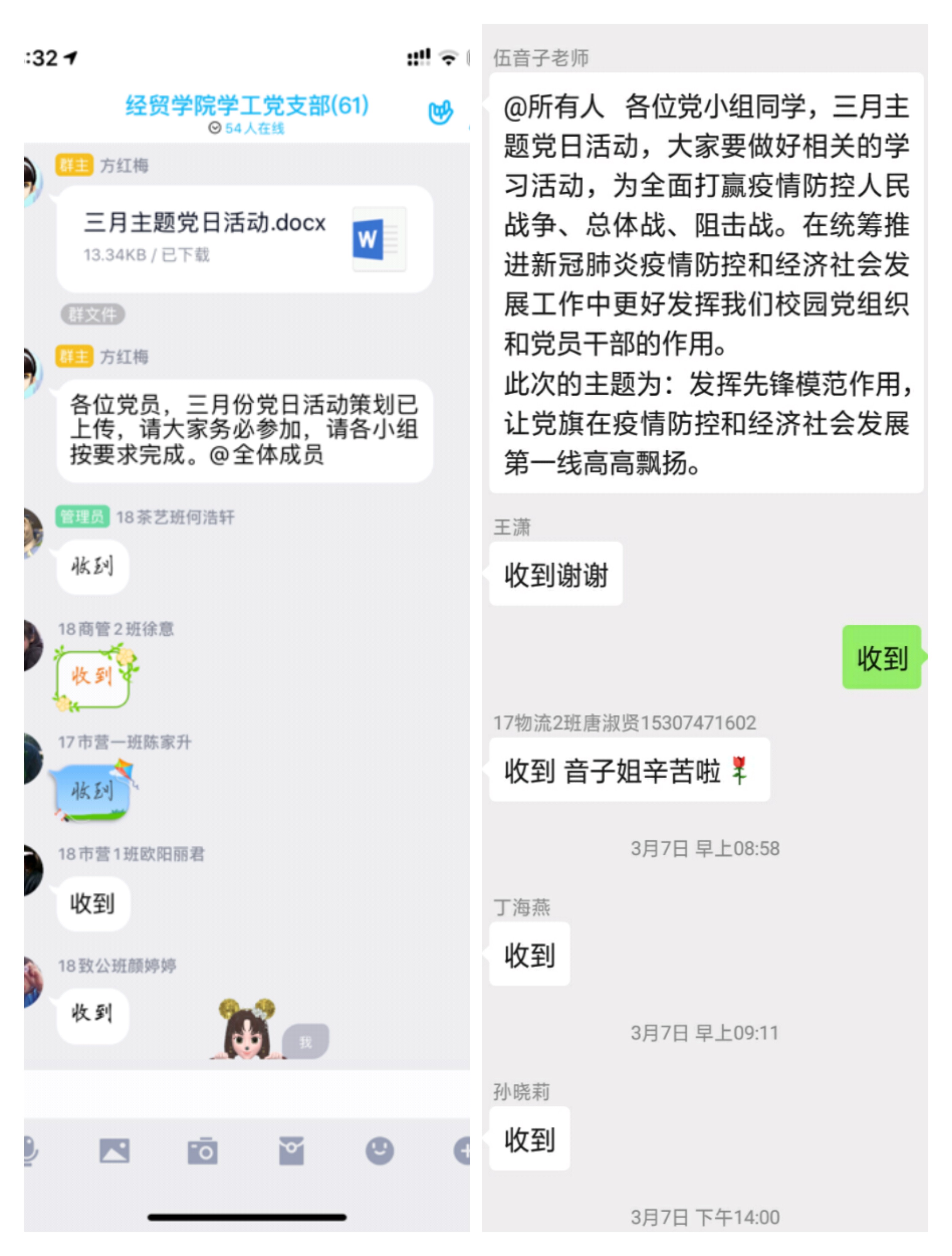 2020年3月7日14:30,经济贸易学院学工党支部全体党员以小组为单位在线上开展“发挥先锋模范作用”“云”主题党日活动。本次活动共分为8个党小组,17级毕业生党员在工作之余也积极参与。