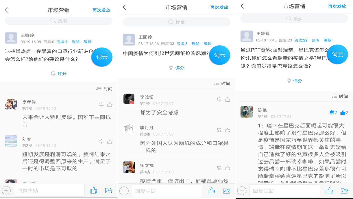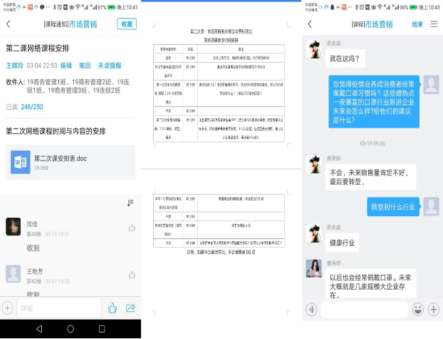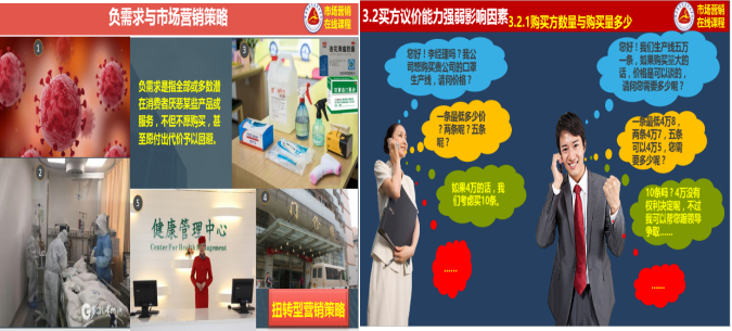 精心挑选教学内容,疫情案例无痕植入。在教学资料的准备过程中,教学团队成员借助各类营销公众号等学习平台搜集大量疫情相关的企业案例,在各知识点中有机融入。如在“需求状态与营销任务”一节授课内容中, 以“病毒感染医疗需求”为例说明负需求概念以及应对措施学生深有感触,在“行业环境分析”内容中用“口罩设备购进”模拟活动来解释买方讨价还价能力就比较容易被学生理解??魏笤谘巴ㄌ致矍型üシ?ldquo;转行做口罩暴富”、 “中国疫情引起世界厕纸抢购风潮”、“瑞幸咖啡千里送无人咖啡机” 等新闻来设计与知识点及思政相关思考题引导同学们参与讨论,在知识拓展栏目录制了“2020年新冠疫情后的行业机会”等疫情主题的营销讲座拓宽学生视野同时提高学生职业敏锐度。