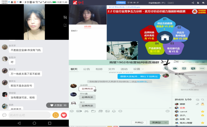 巧妙设计教学环节,疫情思政无声链接。每一个教学内容中,王娜玲都会考虑怎么渗透“育人”内容。“祸福相依、危也是机”,疫情是最好的教育,灾难促使人类思考,促使人类反思。在新闻播出“病毒与野生动物捕杀食用相关”信息之后,课程团队第一时间更换“绿色营销观念”知识点的思政内容,提出“吃素与吃肉哪个更环保?”质疑式问题并播放“我们不是食物”的公益视频,倡导“拒食野生动物从我做起”;疫情期间“钟南山院士”不仅是民众心中的民族脊梁更是拯救英雄式存在,其影响力不容置疑,因此在“有害需求”知识点中渗入钟南山院士的“生命只有一次”的远离毒品的思政内容更能直击学生心灵;“慎独”是中国的古训,但喧嚣的生活剥夺了人们反思自己的时间,疫情期间的宅居独处却补偿了这种缺失,人如企业,在“替代品企业威胁”知识点中从企业引申到人,引导学生思考“如何让自己在未来工作岗位上不被替代?”