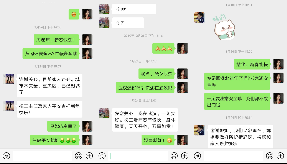 自获悉疫情的严重性之后,王娜玲马上通过微信、电话等方式联系湖北籍贯的同事、黄冈职业技术学院以及华中科技等湖北地区同仁,询问当地疫情的情况并表达了关心与问候。对所带的顶岗实习毕业生及时跟踪他们的情况并不定期叮嘱他们疫情安全注意事项,嘱咐不要在此期间去企业顶岗。
