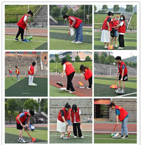 校园是我家,卫生靠大家。通过志愿者们的共同努力,学校田径场焕然一新。学校公共场所的卫生需要我们每一个同学的细心呵护,舒适的学习、生活环境也需要大家共同来营造。希望同学们进一步增强文明意识和劳动意识,从我做起,从身边的小事做起,主动参与到爱护环境中来,为美丽校园添新彩!