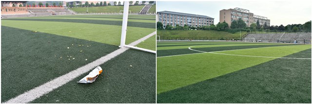 田径场草坪清理前后对比(左为清理前,右为清理后)