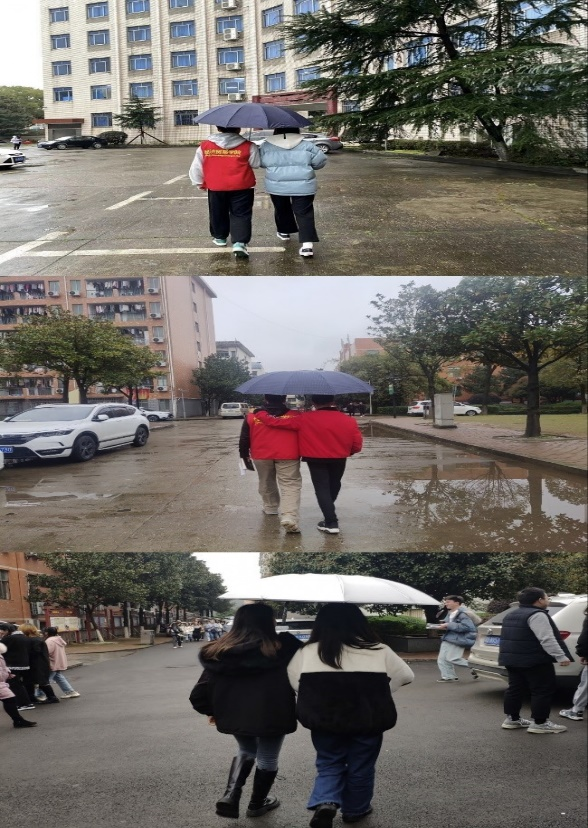 由于今天细绵绵的雨一直未停,在上下课的间隙,遇到没有带伞正准备一股脑往外冲,正犹豫发呆,或是正需要帮助的同学们时,我们志愿者一声“同学,你好!”,送同学们去他们要去的地方,一把把雨伞像蒙蒙细雨中绽放的彩色小花。其中张佳林同志分享了她的感受:“当听到同学的那句有温度的谢谢,自己都会不假思索的回答:‘不客气,请你以后也要帮助有需要的人。’”