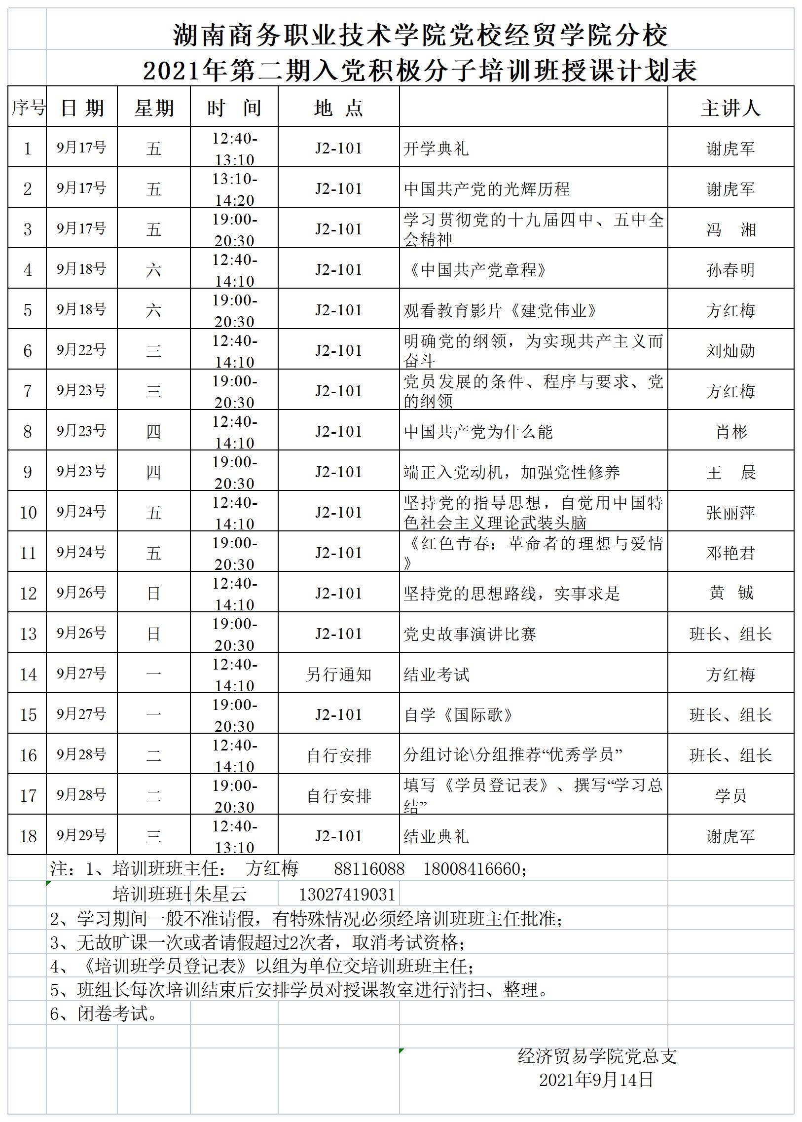 湖南商务职业技术学院党校2021年下半年党员发展对象培训班授课计划表