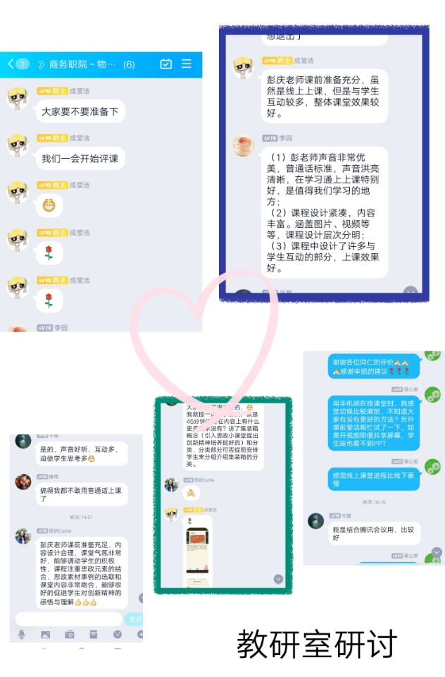 公开课结束后,院部教研室老师立即组织线上研讨评课活动,大家同时交流分享各自这两天开展线上教学的经验,集思广益,以期在接下来的在线教学中取得更佳的教学效果。