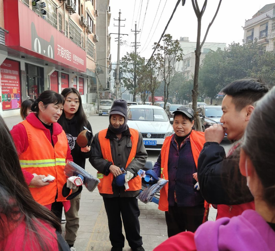 ▲志愿者给环卫叔叔、阿姨们送上手套、耳罩