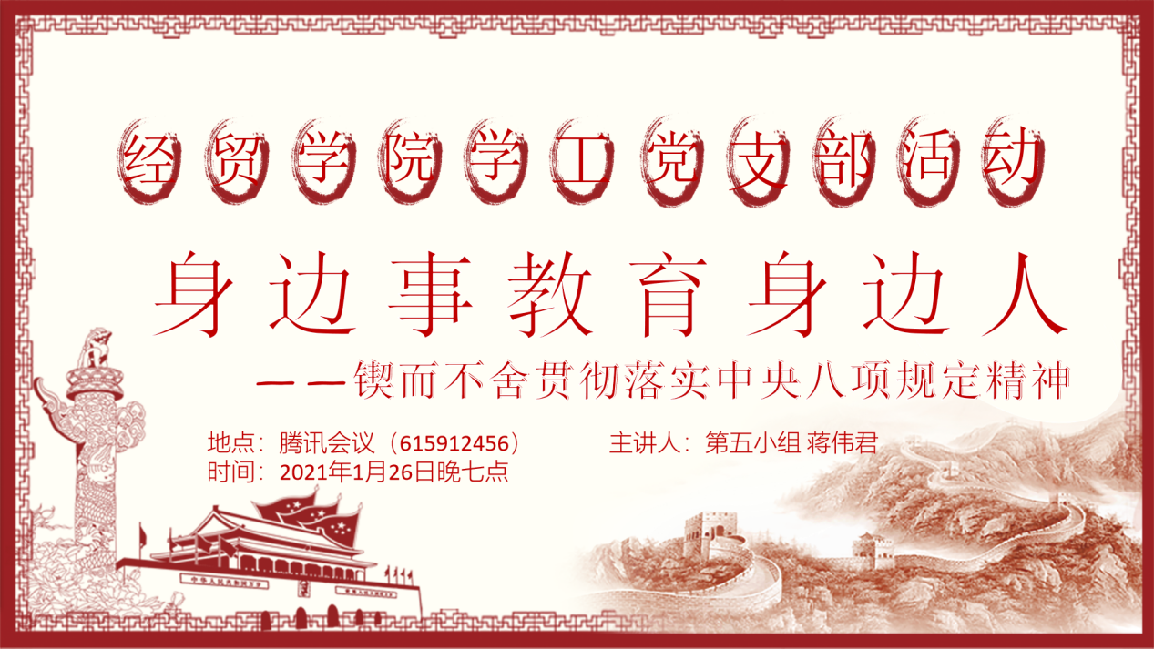 (通讯员 易荣淼)为锲而不舍的学习贯彻落实中央八项规定精神,坚持严字当头,敦促支部全体党员自觉加强党性锻炼,强化思想认识,不断筑牢廉政意识,2021年1月26日晚上7:00,经济贸易学院学工党支部通过腾讯在线会议网络平台开展“以身边事,教育身边人”主题党日活动。本次主题党日活动由“青春向党”先锋营第五小组蒋伟君同志主持,经济贸易学院学工党支部全体党员、入党积极分子参加此次活动。