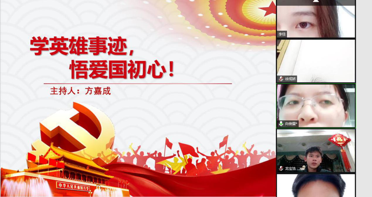 (通讯员 方嘉成)祖国山河终无恙,守边护边志更坚。为深入学习边防官兵们的英雄事迹,弘扬爱国主义精神,激发支部党员、入党积极分子的爱国热情,2月24日晚上7:00,经济贸易学院学工党支部通过腾讯会议网络平台开展 “学英雄事迹·悟爱国初心”主题党日活动。本次活动由“青春向党”先锋营第四小组方嘉成同志主持,经济贸易学院学工党支部全体党员、入党积极分子参加此次活动。