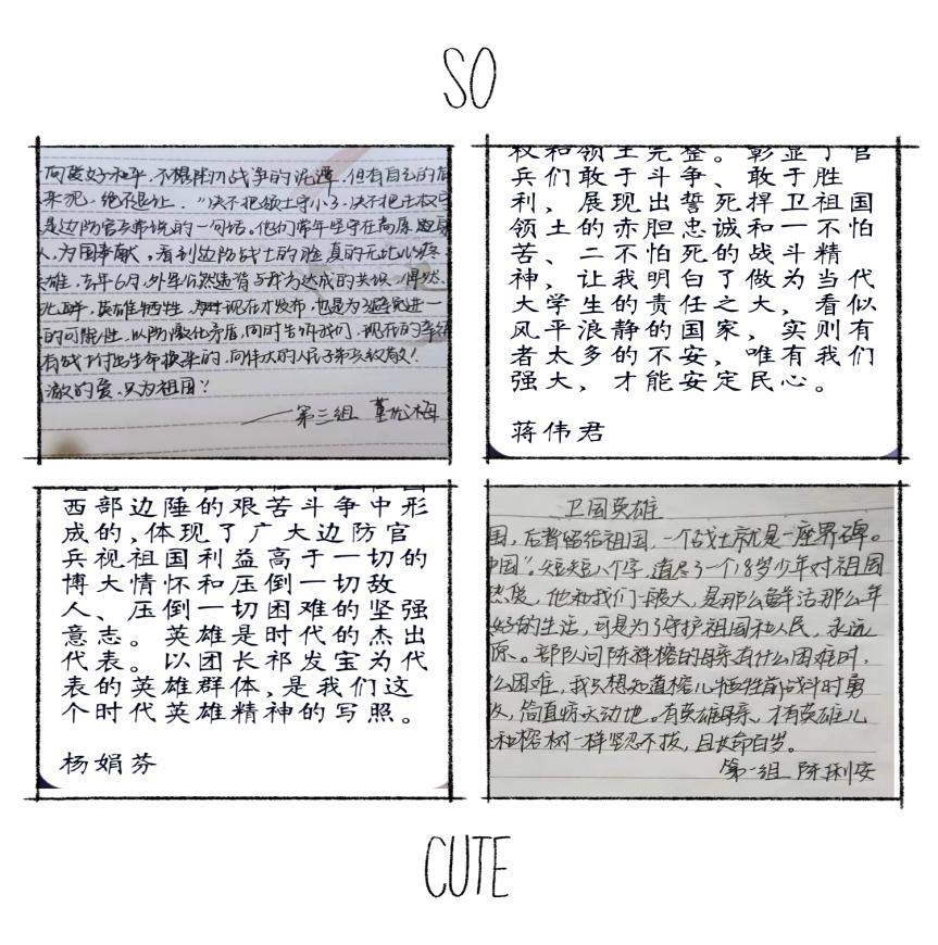 因为他们在,我们从未担心过边防??赐晔悠?,同学们深深地受到了鼓舞和激励。其中,蒋伟君同志说到:“戍边英雄的事迹深深地感染了我,一代又一代的守边战士们把青春献给了祖国最需到的地方,不忘初心,时刻守护祖国的每一寸热土,这种精神便是我们大学生学习的榜样。”向俊霖同志感言到:“我们应该记住每一位扎根于边防的战士们,他们正如一座座界碑,守护着我们祖国的安全。”沈芷瑶同志表态:“他们怀揣着‘我们的脚下,我站立的地方就是中国’的责任和自豪,用铁肩担当诠释着对党和人民的绝对忠诚。历史不会忘记边防战士,人民不会忘记边防战士,让我们向边防战士们致敬!” 我们今天的和平来之不易,每一位英雄烈士都值得铭记。线上会议结束后,各小组继续通过小组群进行讨论和交流。通过此次党日活动的学习,同志们纷纷表示要将爱国情怀和强国志向付诸于行,将自身专业学习融入社会发展中,为建设富强美好的祖国而奋斗。