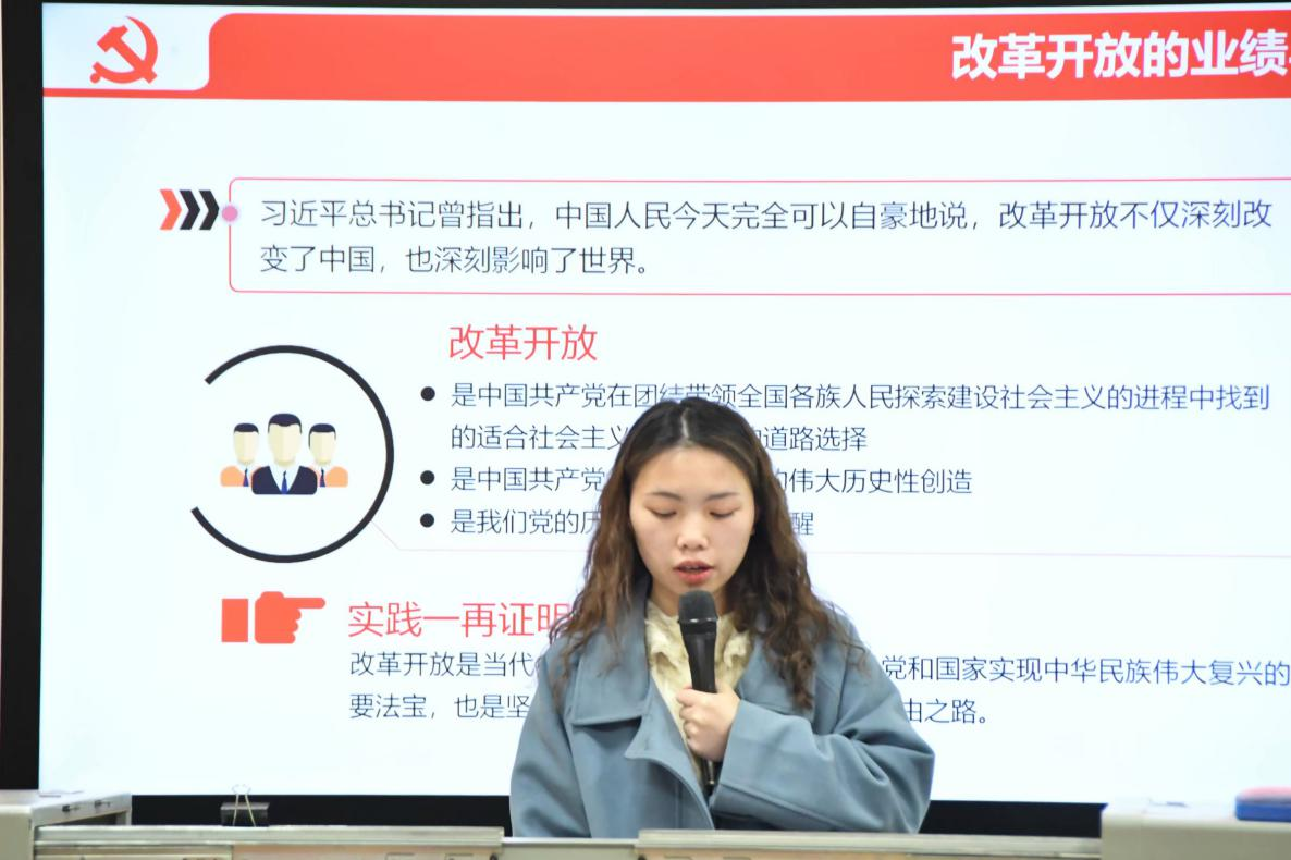 首先,主持人徐成娇同志讲解了‘四史’中的改革开放史,是一部中国共产党推进社会主义制度自我完善和发展的实践史。在讲述过程中,她带领大家一起观看了学习视频“缅怀先烈·改革开放的中国成果”以及“习近平总书记的党史学习教育大会上的讲话重要精神”。让大家从宏观上了解到改革开放以来我国在多领域取得了骄人的成绩,国家综合国力与人民生活焕然一新。
