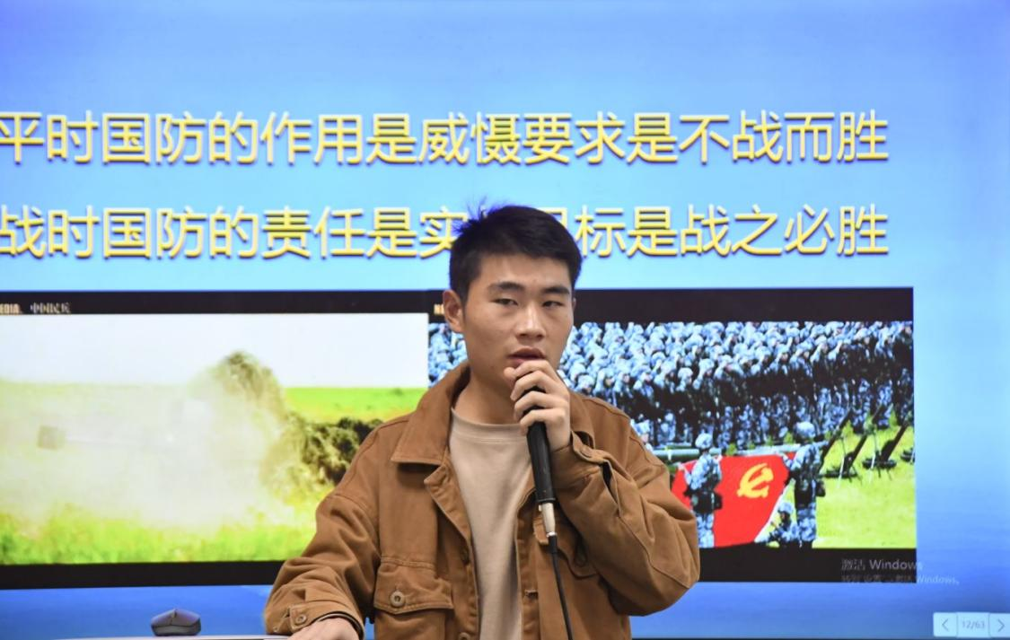 随后,胡江南同志分享了有关国家国防安全的真实案例。其中提到阿富汗政治现状、中越争端的南海问题。针对此类事件,他以自己在军队的所见所闻更为直观的表述了对于国防的见解。他告诉我们:“平时国防的作用是威慑,要求不战而胜;战时国防的责任是实战,目标是战之必胜。”接下来,胡江南同志讲述了保卫我国国防的组织——人民军队。没有人民军队的捍卫,就没有今天稳固的国防。他说:“抗洪救灾,人民军队奔走效劳;抗疫一线,人民军队一马当先;中印冲突,人民军队敢拼敢打……他们是钢铁的城墙,是和平的保障。不管在任何地方守卫的人民军队,因为有他们的存在,我们才能幸福的生活”。