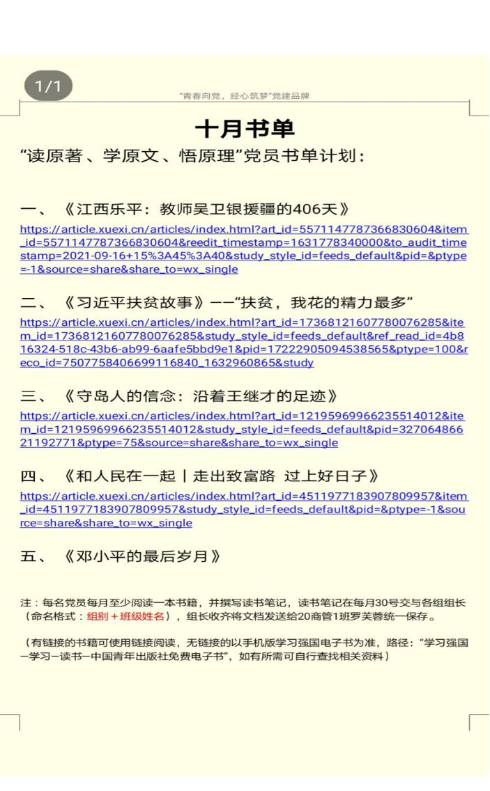 (通讯员 周自立)博观而约取,厚积而薄发。为使支部党员、入党积极分子保持阅读习惯,博览群书。2021年10月份期间,经济贸易学院学工党支部组织全体预备党员和19、20级入党积极分子开展第十五期“读原著、学原著、悟原理”党员书单计划活动。