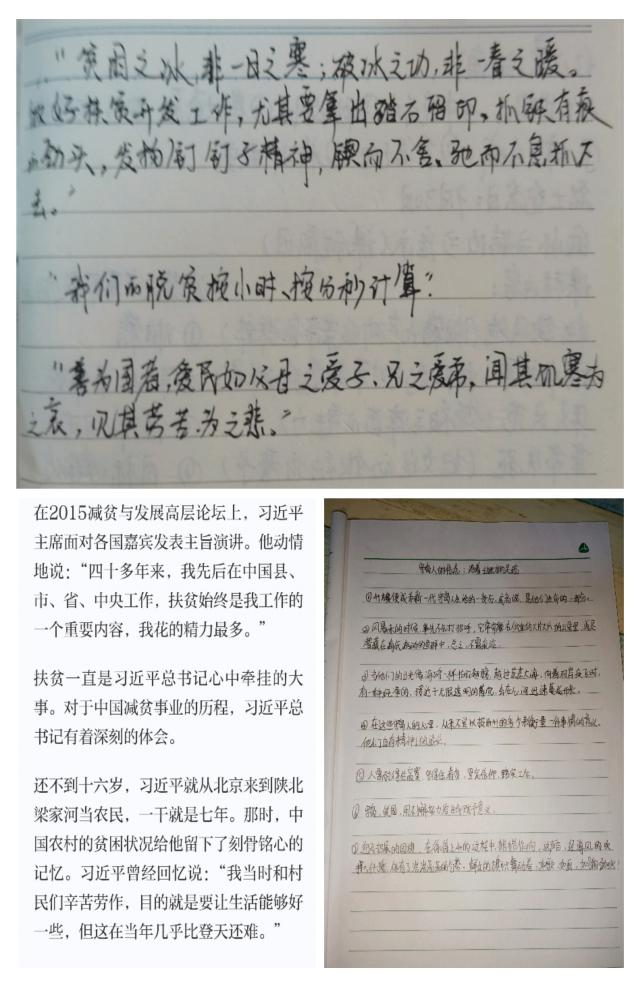 入党积极分子刘馨雅同学《习近平扶贫故事》——“扶贫,我花的精力最多”她写到“贫困之冰,非一日之寒;破冰之功,非一日之暖。做好扶贫工作要脚踏实地。不仅仅体现在扶贫工作中,日常生活也要注重脚踏实地、干实事。中国共产党人为扶贫事业的付出,值得我们学习、深思、借鉴。”
