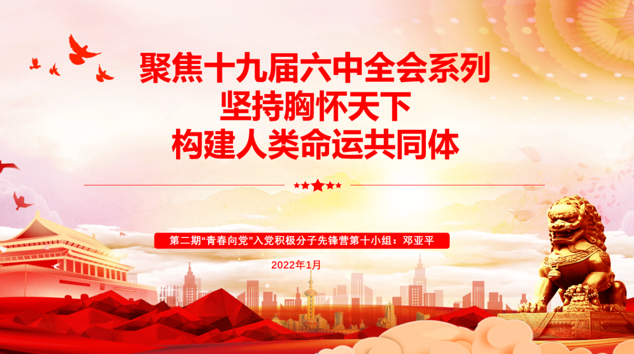 (通讯员 王世超)为深入学习党的十九届六中全会精神,深刻理解“坚持胸怀天下”的重要意义。1月12日20:00,经济贸易学院学工党支部以线上会议形式组织开展“聚焦十九届六中全会”第六次主题党日活动“坚持胸怀天下——构建人类命运共同体”。此次主题党日活动由第二期“青春向党”入党积极分子先锋营第十小组邓亚平同学主持,经济贸易学院学工党支部全体党员、入党积极分子参加此次活动。