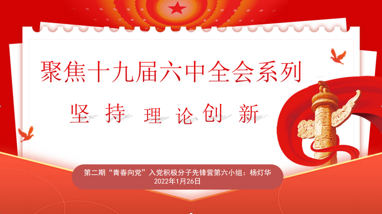 (通讯员 刘睿希)为深入学习贯彻党的十九届六中全会精神,深刻领悟党的宝贵历史经验,2022年1月26日20:00,经济贸易学院学工党支部以线上会议形式组织开展“聚焦十九届六中全会”第八次主题党日活动“坚持理论创新”。经济贸易学院学工党支部全体党员、入党积极分子参与此次活动,此次活动由第二期“青春向党”入党积极分子先锋营第六小组杨灯华同学主持。