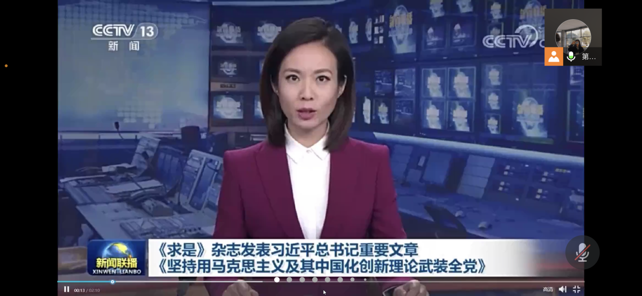 接下来,主持人带领大家观看学习视频。视频讲述了习近平新时代中国特色社会主义思想作为马克思主义中国化的最新成果,坚持和运用马克思主义基本原理,对马克思主义哲学、政治经济学、科学社会主义作出了许多重大原理性创新,是实现马克思主义中国化的新飞跃。