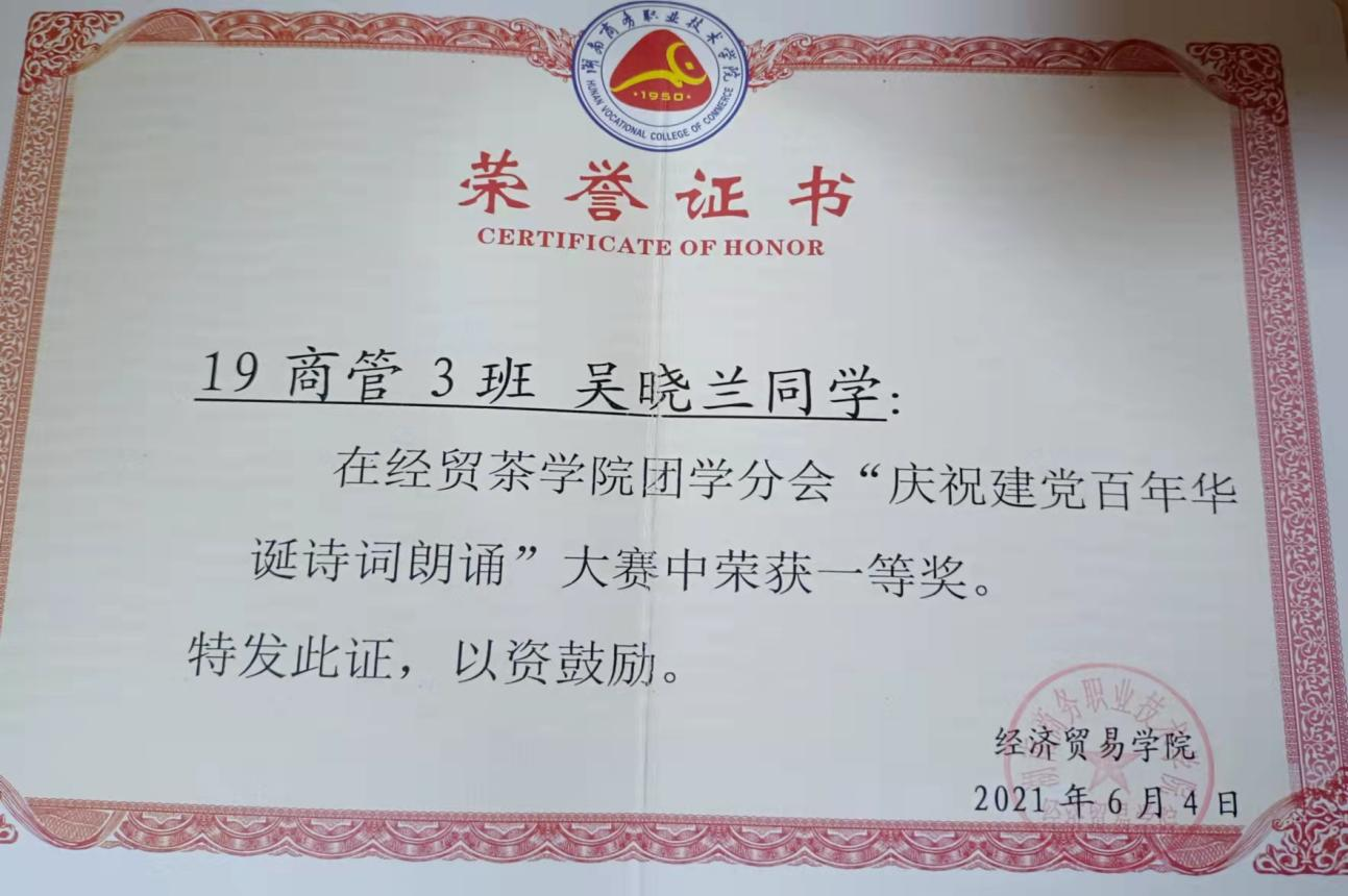 ▲吴晓兰同志在朗诵比赛中荣获一等奖荣誉证书
