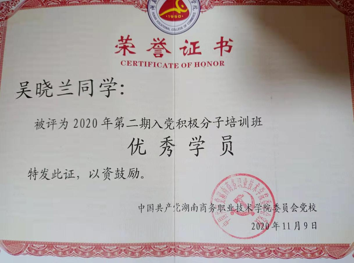 ▲吴晓兰同志被评为“优秀学员”荣誉证书