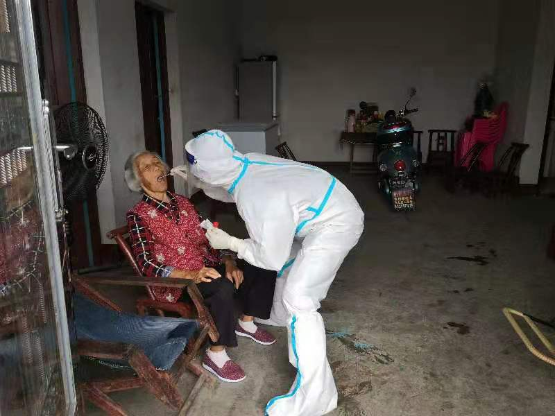 ▲吴晓兰同志随医护人员以及村干部下乡给乡亲们做检测