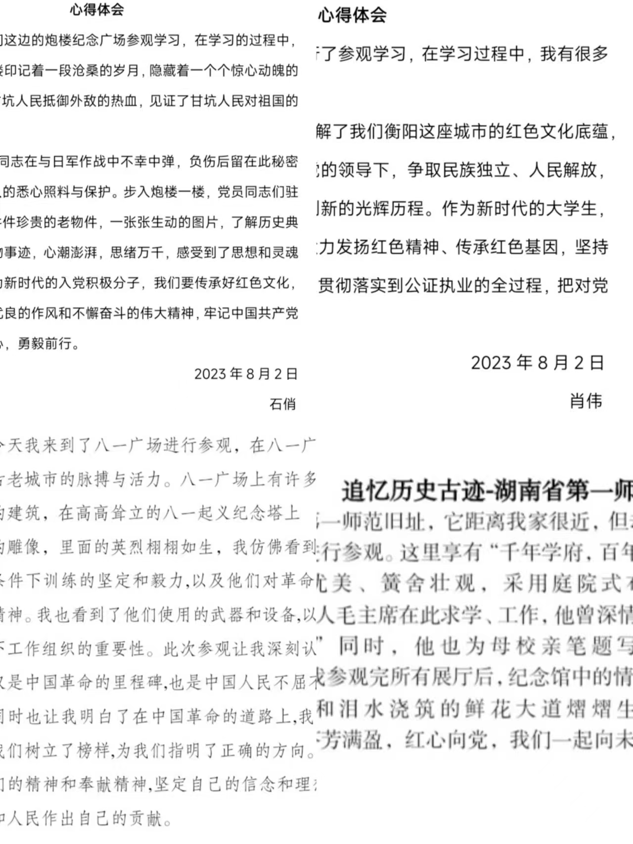 其中,22级营销2班杨宇欣来到了享有“千年学府,百年师范”之美誉的湖南省第一师范旧址参观学习。她说:“当我参观完所有展厅后,纪念馆中的情景依然在脑中一一闪过?;赝词钡穆?,一条用鲜血和泪水浇筑的鲜花大道熠熠生辉,作为新时代的中国青年,我们一定要永葆红色初心,坚定理想信念。”22级营销1班兰浩哲来到了南昌八一广场进行参观。他有感而发:“通过参观学习,我认识到八一起义不仅是中国革命的里程碑,也是中国人民身上不屈不挠精神的体现。同时,这也让我们明白了在中国革命的道路上,许多先烈为我们树立了榜样,为我们指明了正确的方向。作为新时代的青年大学生,我们应该学习他们的革命精神和奉献精神,坚定理想信念,立志报效祖国、服务人民。”