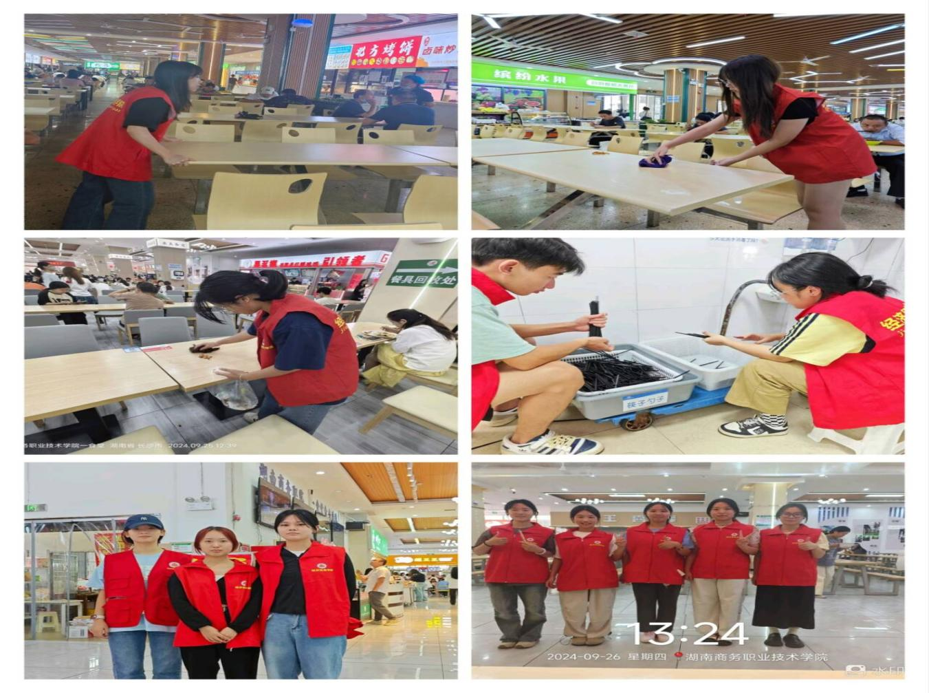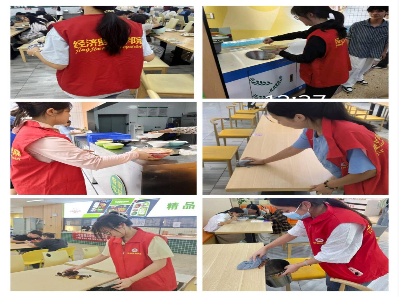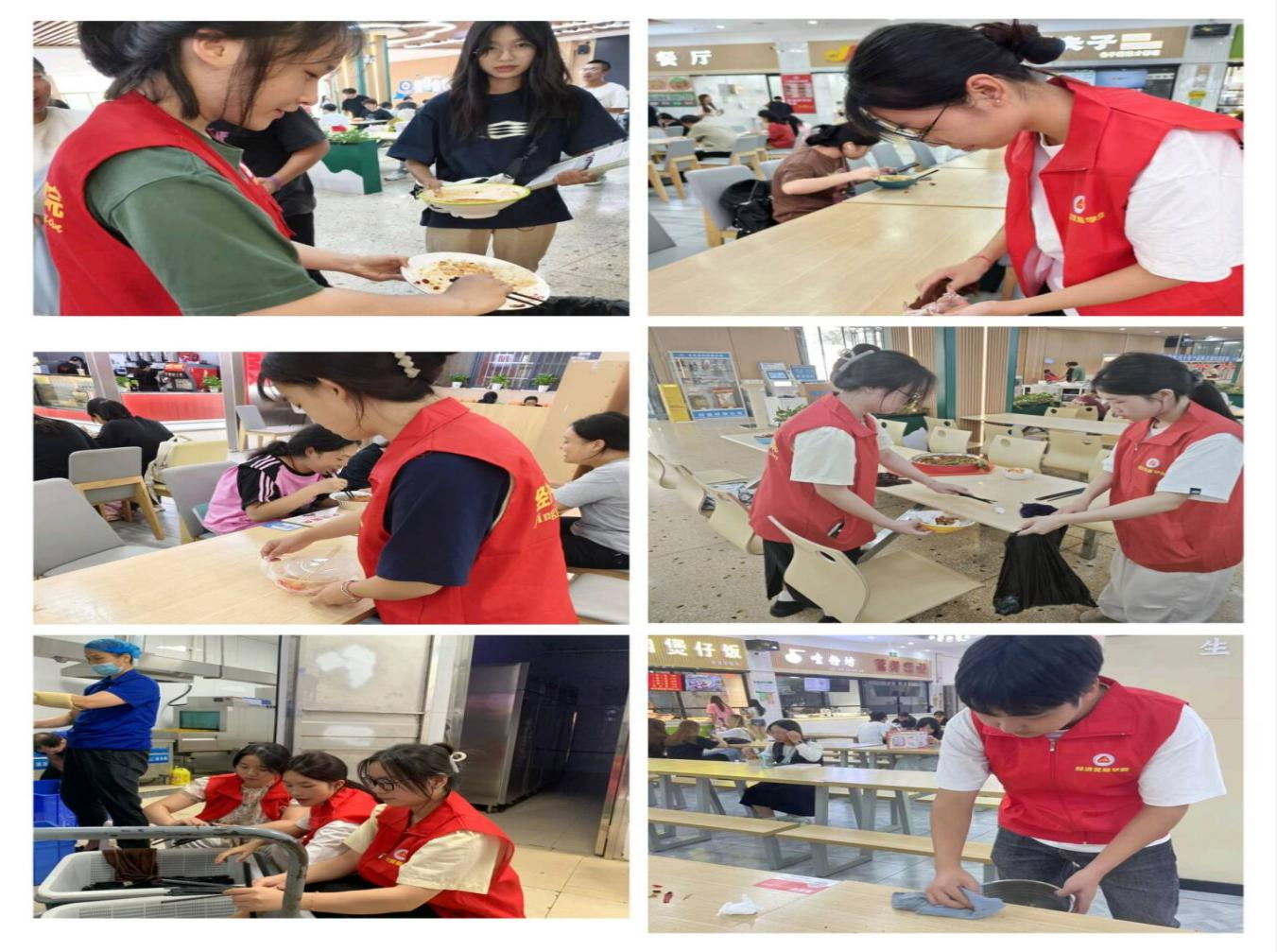 在为期两周的活动中,志愿者们换上了标志性的志愿服装,以饱满的姿态投入到食堂的志愿服务之中。志愿者们分工明确,有的负责后厨清洗工作,确保每一件餐具都洁净无瑕;有的则忙于擦拭桌面和椅子,让食堂的每一个角落都散发出清新的气息……他们的努力不仅提升了食堂的卫生质量、为师生们营造了一个更加舒适的用餐环境,更是通过积极实践体会到食堂工作者的敬业精神。