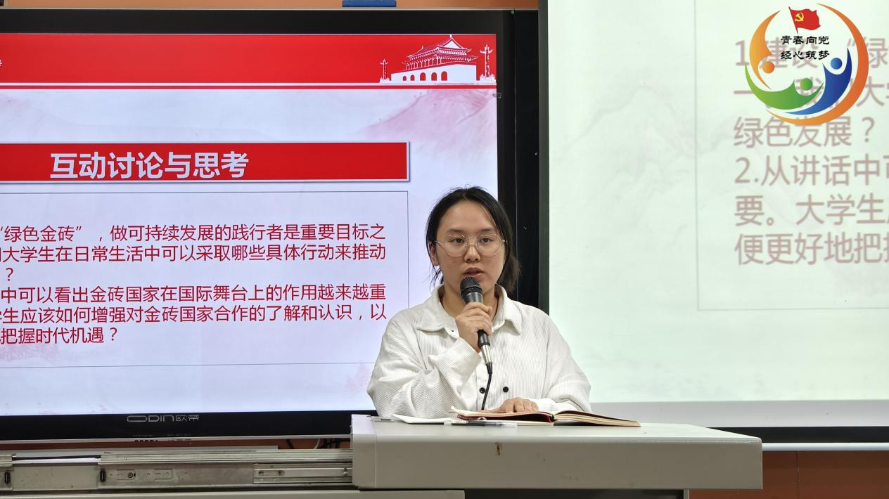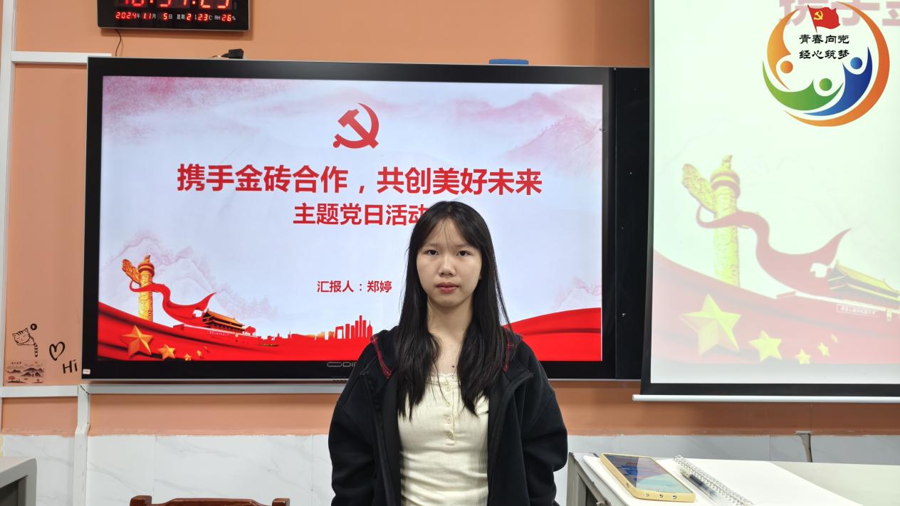 (通讯员 晏艳阳)同心山成玉,协力土变金。为促使支部党员、入党积极分子进一步深入了解国家新发展理念、感悟“金砖精神”,2024年11月5日晚7时,经济贸易学院学工党支部在博思楼101教室组织开展“携手金砖合作,共创美好未来”主题党日活动,此次活动由23级全媒体广告策划与营销1班郑婷主持,经济贸易学院学工党支部党员及入党积极分子参加此次活动。