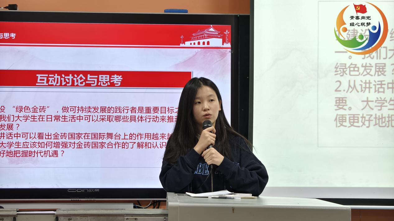 最后,主持人组织大家从“‘做可持续发展的践行者’大学生可以有哪些行动?”和“如何进一步了解金砖国家合作的意义、影响和未来发展趋势?”进行讨论。23级商务管理1班高静怡说道:“作为一名大学生,我深知我们能为可持续发展贡献力量。例如,在校园中我们可以积极参与环保社团组织的活动。在日常生活中,尽量不使用一次性餐具,从源头减少白色污染,践行绿色低碳环保理念。” 23级市场营销(楚怡)2班白一茜说道:“‘非学无以广才,非志无以成学。’作为青年大学生,我们要持续不断勤学实干求真知。例如,我们可以借助学??纬?、图书馆资源和线上平台等多种渠道,更好地理解国际形势变化趋势,提升自身的国际视野和跨文化能力。”