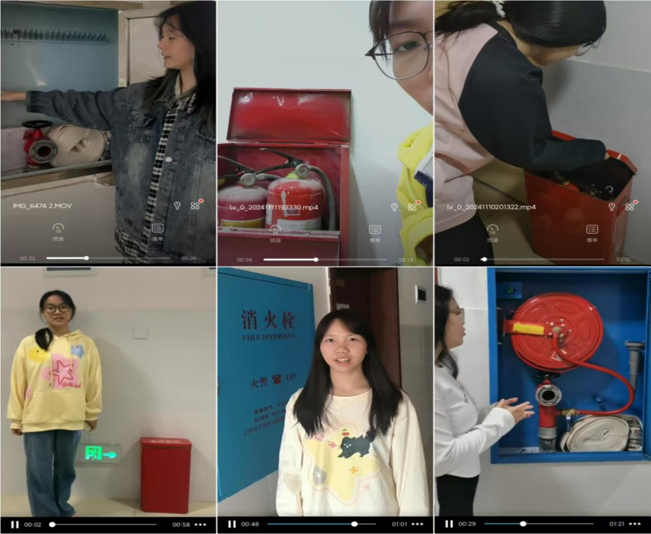 活动开始,同学们找到学校的消防设备,化身科普宣讲员,一一讲解其功能、使用方法和注意要点。这些科普视频将成为校园消防安全教育的优质素材,助力更多同学熟悉消防设备,强化消防安全意识。